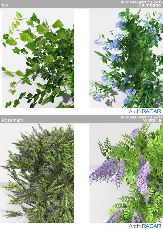 16 3D models of several plants, compatibles with ArchiCAD 16 or higher and CineRender.