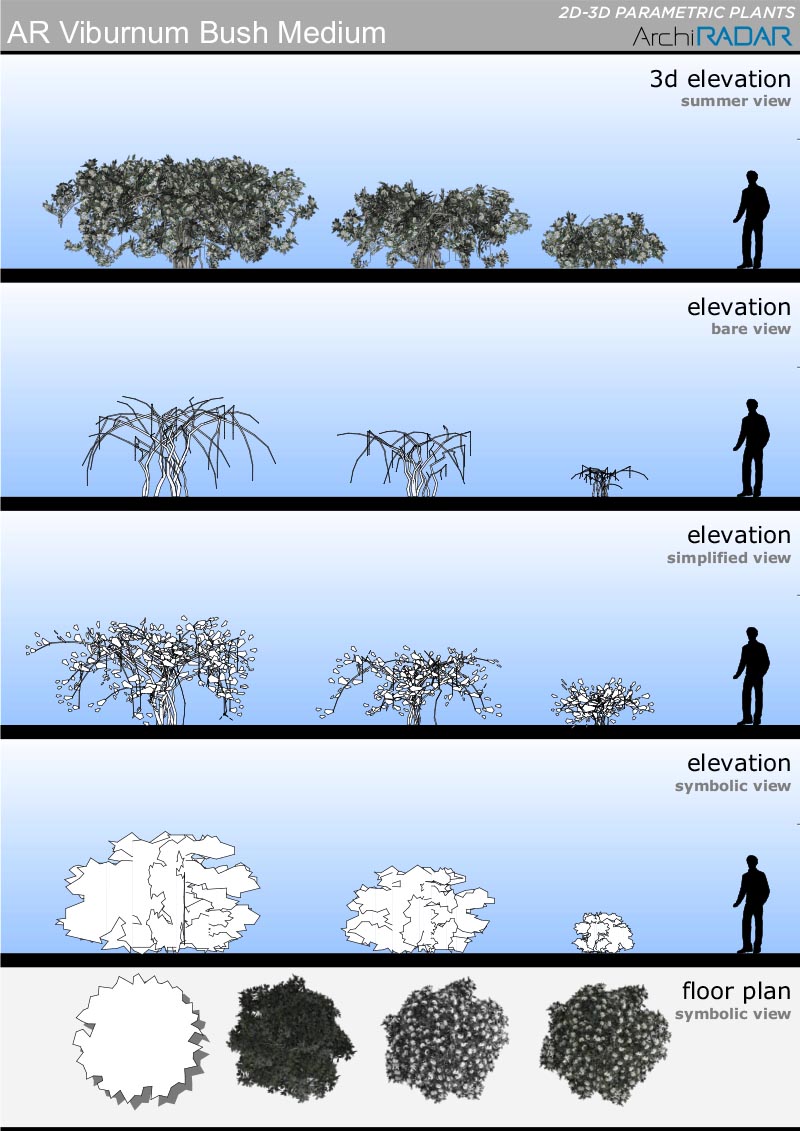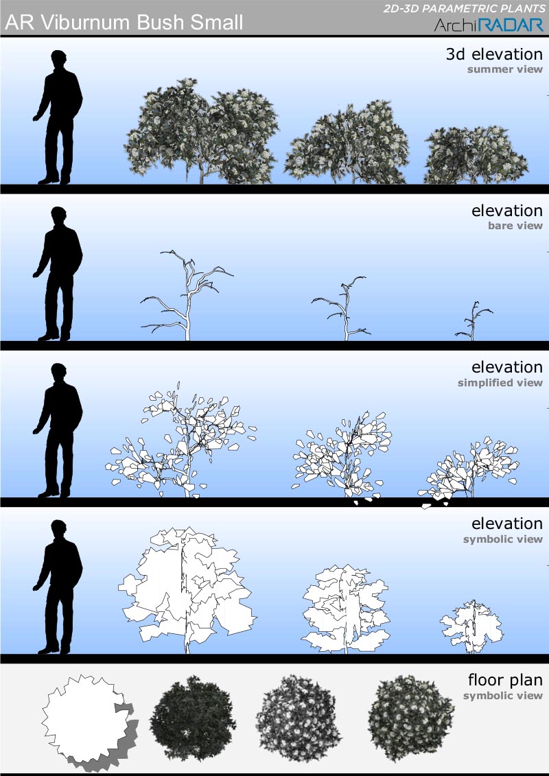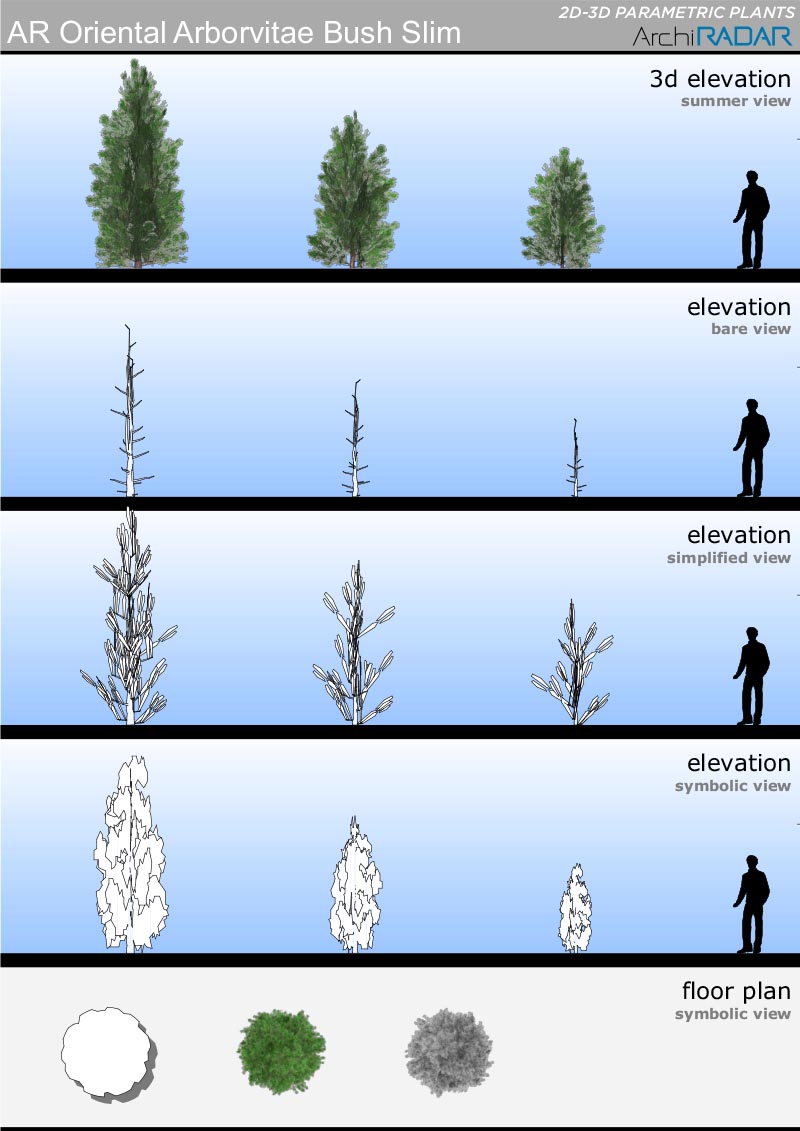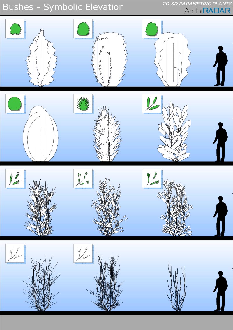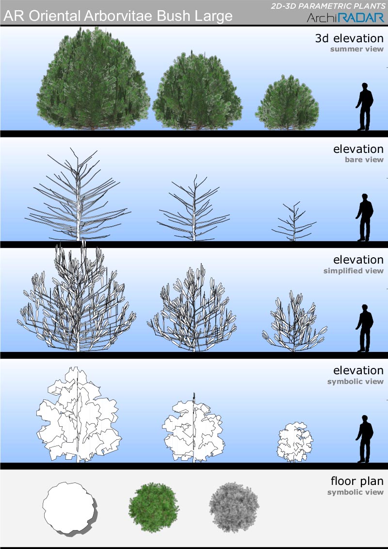 The objects are made with a low polygon quantity, they have a real growing factor according to the size and a corresponding symbolic view in elevation. Optimized for BIMX.