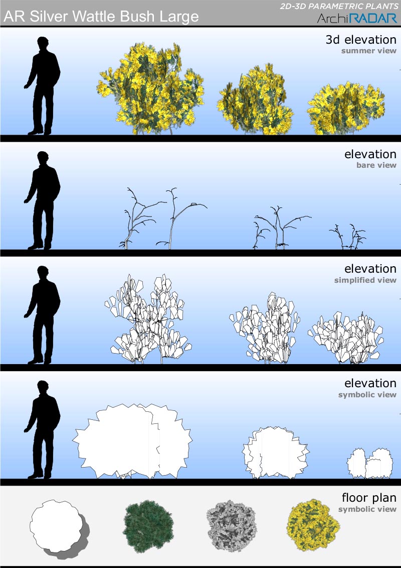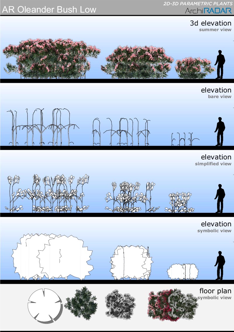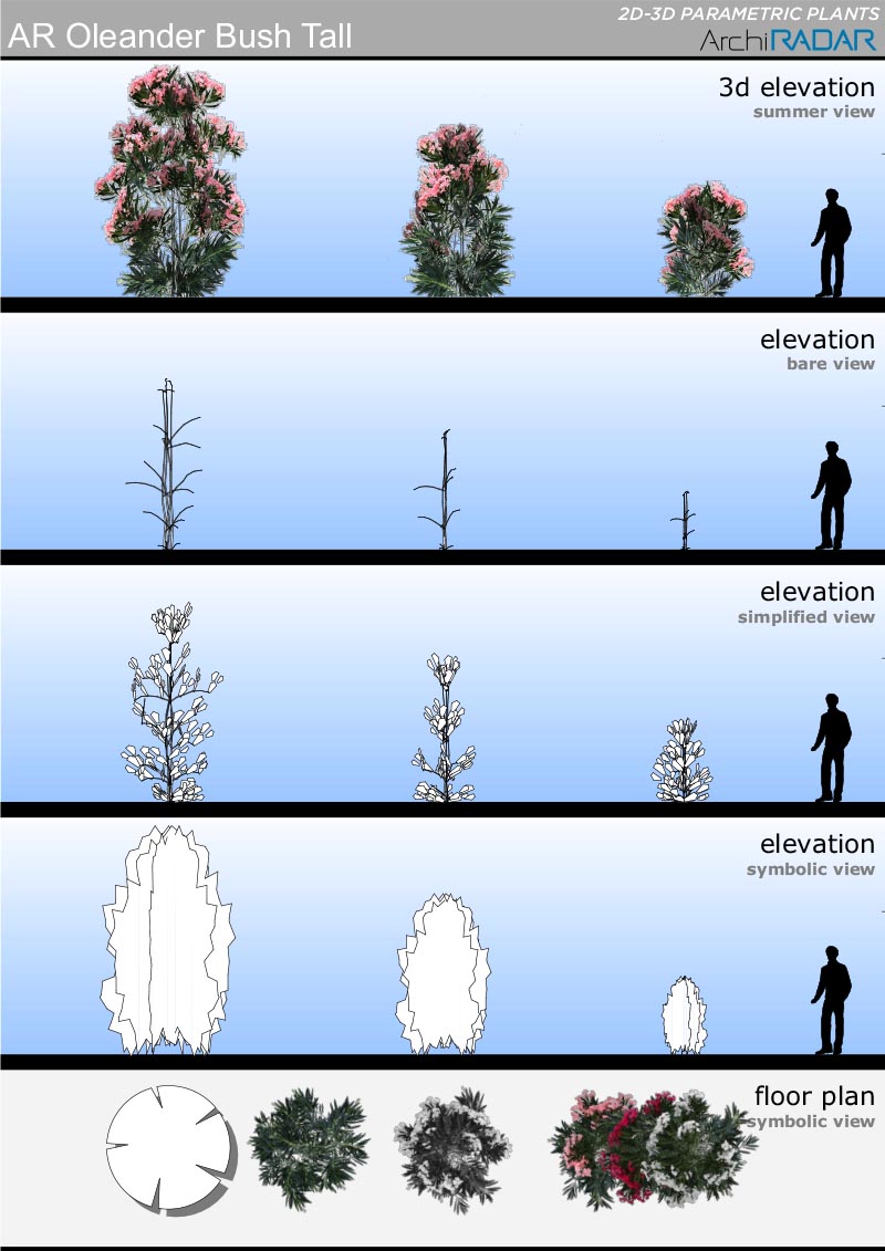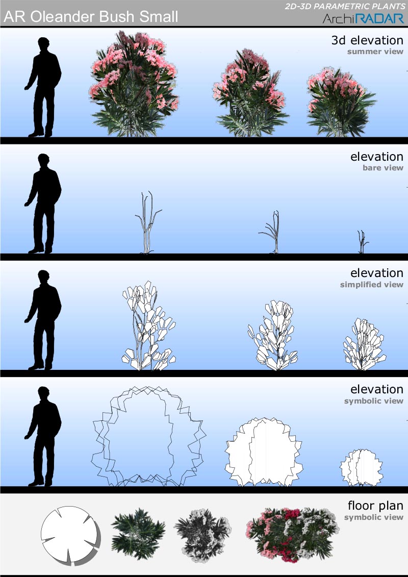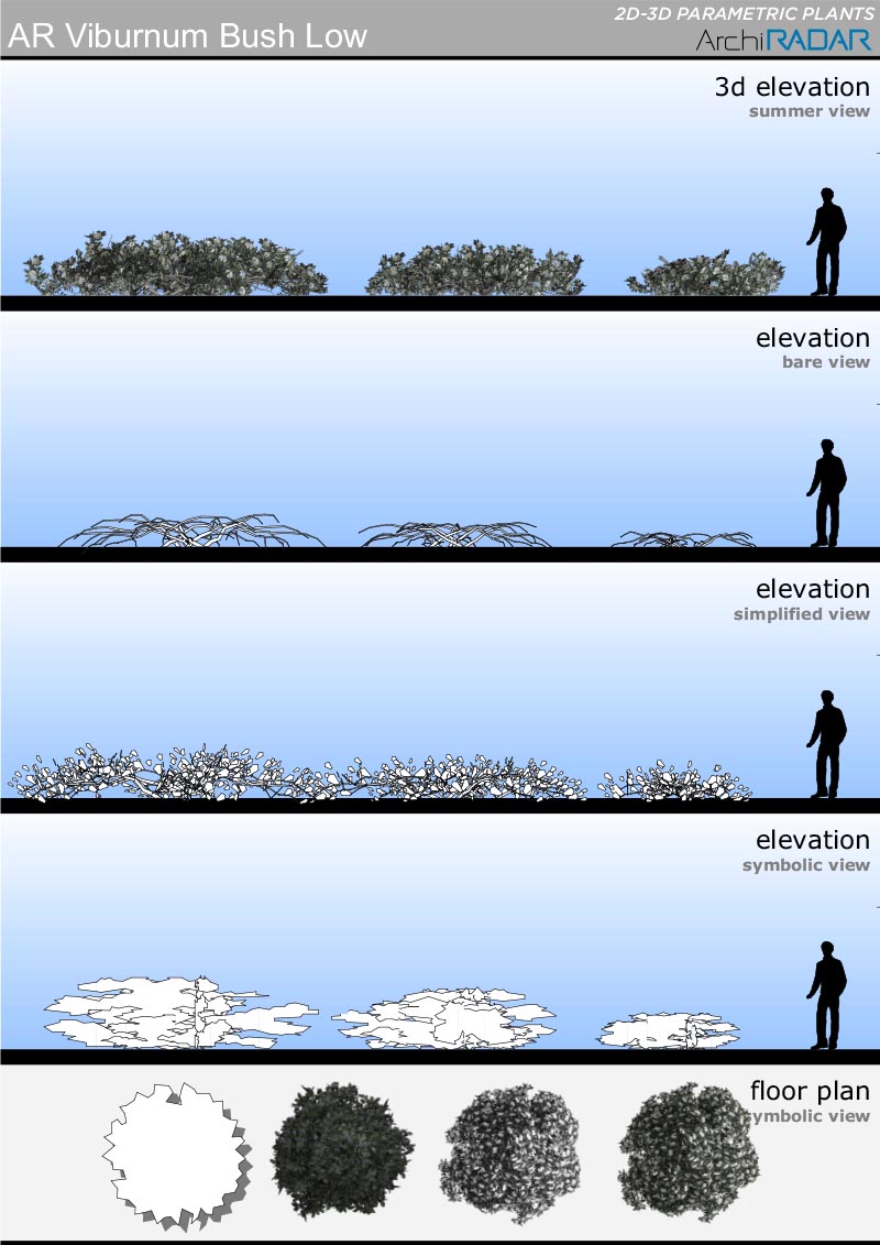 The objects are made with a low polygon quantity, they have a real growing factor according to the size and a corresponding symbolic view in elevation. Optimized for BIMX.