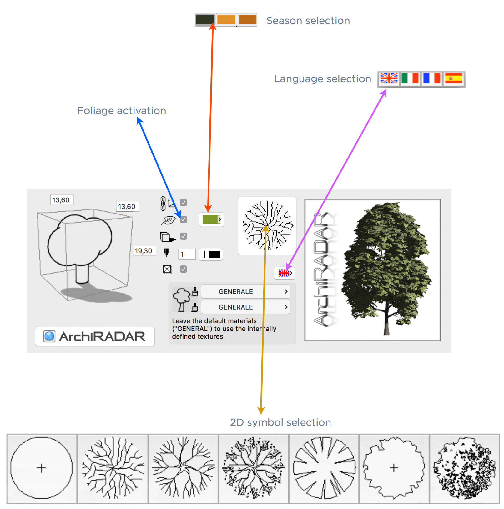 In addiction to that, for each species there is a seventh object called "Random Tree": it's a useful tool that, with a simple click, adds to the scene a random tree in order to avoid repetitions.