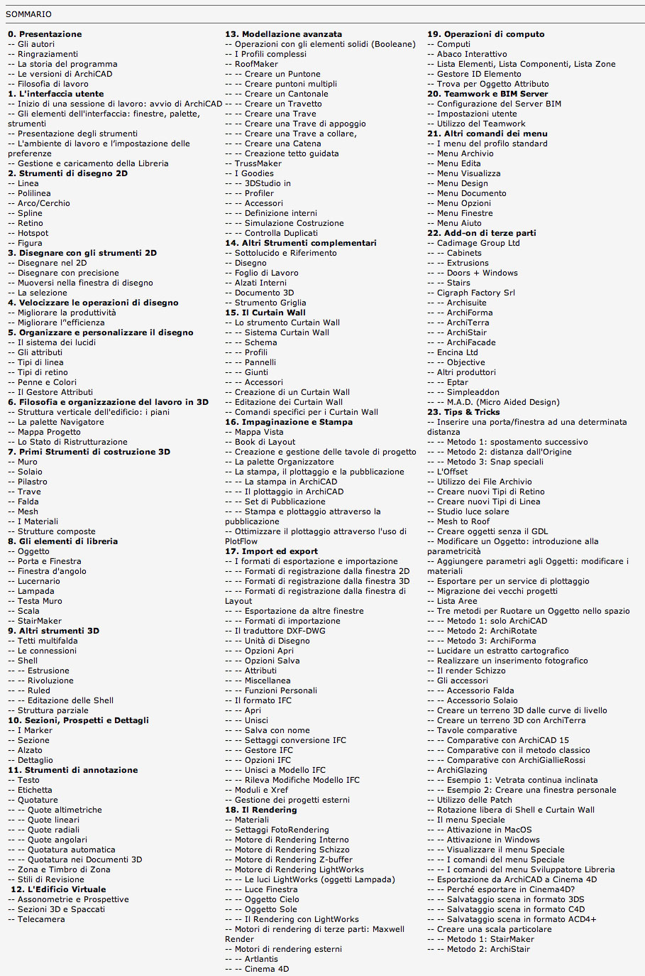 In questa edizione abbiamo voluto inserire molti tutorial e suggerimenti utili per il lavoro quotidiano del progettista, con esempi pratici su come realizzare i disegni comparativi (gialli/rossi), su come lucidare un estratto cartografico, realizzare un inserimento fotografico del modello e altro ancora. Adesso non ci sono più scuse per imparare ad usare ArchiCAD: all'interno del manuale troverete tutto ciò che avrete bisogno di sapere spiegato in modo semplice e chiaro e corredato da immagini di esempio. Questo non è un semplice manuale, ma è IL Manuale per apprendere l'uso di ArchiCAD o anche solo per approfondire le novità della versione 15.