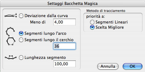 Nella finestra che appare potete scegliere in che modo ArchiCAD creerà in automatico i segmenti lungo le curve. Vediamo qualche suggerimento: Come metodo di tracciamento scegliete sempre "Scelta Migliore" in quanto ha un risultato migliore dell'altro. Per "alleggerire" la mesh e quindi far creare dei punti più distanti dovete o diminuire i "Segmenti lungo l'arco" portandoli da 36 a valori minori (20, 15, 10 .. dipende..) oppure aumentare il valore di "Deviazione dalla curva" portandolo su 10, 20 o più ... La scelta che consiglio è quella di diminuire il numero di segmenti lungo l'arco. Per il valore più appropriato da inserire bisogna far delle prove: se il numero è troppo basso le curve saranno tradotte in vere e proprie spezzate, linee rette, se è troppo alto (come abbiamo visto prima) creerà veramente troppo punti uno accanto all'altro.