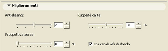 Oltre a questi si possono settare i colori con cui si vuole che venga realizzato lo schizzo. La voce tessiture vettoriali la vedremo più avanti un capitolo a parte. Nel pannello "Miglioramenti" si possono settare alcuni parametri che influiscono sulla qualità dell'immagine ottenuta.