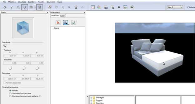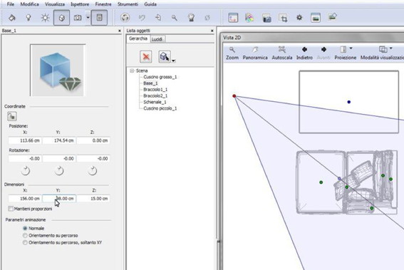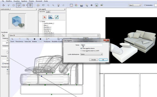 Utilizzando la finestra Vista2D come aiuto, spostate/duplicate/ridimensionate gli oggetti che avete separato, fino a comporre il divano di cui necessitate (attenzione alle spunte "mantieni proporzioni" quando ridimensionate un oggetto).
