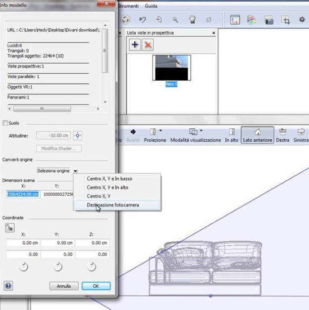 Andate nuovamente in Finestre/Informazioni Scena, puntate l'obiettivo appena sotto l'oggetto e al centro (come mostrato in figura sottostante), quindi tramite il menu a tendina ridefinite l'origine primaria del vostro oggetto.