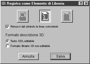 Ovviamente scegliamo, come tipo di file, "Una Finestra", e registriamo all'interno della libreria, meglio se nell'apposita cartella "0.0 Oggetti utente". Prima della registrazione vera e propria ci verrà proposto un dialogo con alcune opzioni. Selezioniamo "Rimuovi dal simbolo le linee coincidenti" e "Testo GDL editabile".