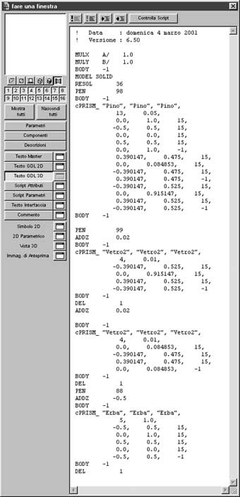 Possiamo già ora vedere che aspetto ha, dal vivo, la nostra creatura. Ha certamente bisogno di ulteriori cure, ma ha già preso vita. A questo punto la parte facile è finita. Sa per cominciare quella divertente. Dal menu "Archivio", selezioniamo "Oggetti GDL/Apri Oggetto..." e apriamo la finestra appena creata (N.B. Se l'oggetto era selezionato in pianta , verrà aperto automaticamente). Attiviamo la finestra Testo GDL 3D e osserviamone il contenuto: si noterà che ArchiCAD ha fatto il suo dovere ... anzi, anche di più. Non è necessario, ma per una migliore leggibiliità io consiglio di eliminare tutte le righe che cominciano con GLOB_ e quelle che iniziano con due punti esclamativi.