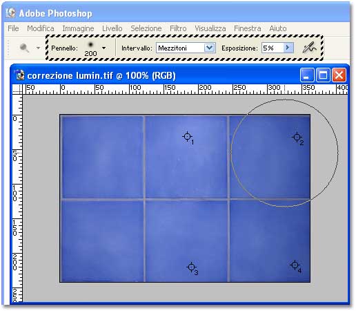 Colloco i punti campione in varie posizioni; per semplicità di lettura, li distribuisco in modo analogo a come compaiono nella palette: il primo in alto a sinistra, il secondo alla sua destra, ecc. Cliccando sul piccolo contagocce, nella palette Info, scelgo la modalità di misura "Scala di grigio", che presumo offra la migliore informazione sulla luminosità. Notate che nella barra in alto, nel menu Campione, ho scelto l'opzione "Media 5x5", perché sarebbe del tutto inutile avere la misurazione effettuata su un singolo pixel arbitrario. Ora, usando gli strumenti Scherma (per aumentare la luminosità) e Brucia (per ridurla), schiarisco o scurisco leggermente le varie aree dell'immagine, finché l'indicazione fornita dai campioni risulta omogenea. È importante usare un pennello molto grande e sfumato, ed applicarlo con passate successive molto "leggere", per evitare segni antiestetici.