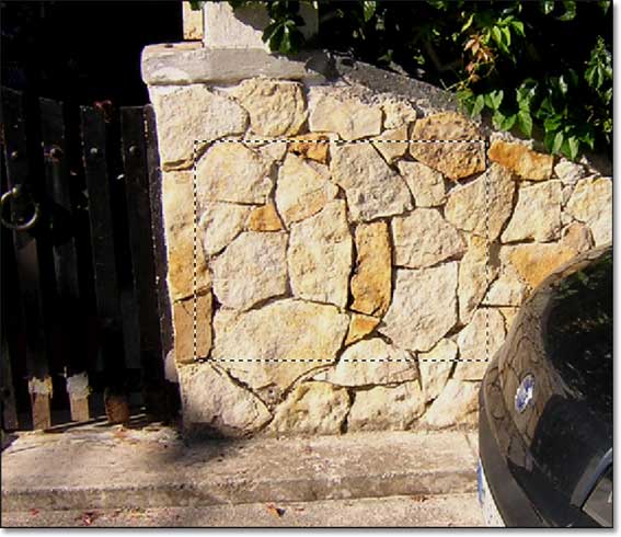 Affiancando l’immagine rettangolare, si notano chiaramente le linee di giunzione. Anche in questo caso sono possibili vari tipi di intervento. Partiamo da una situazione più semplice. Se gli elementi non hanno un contorno particolarmente netto e definito, come nel caso dell’intonaco, della sabbia, dell’erba o di altre superfici semi-omogenee, potremo procedere con maggiore disinvoltura, perché non serve una grande perizia per nascondere la giunzione.