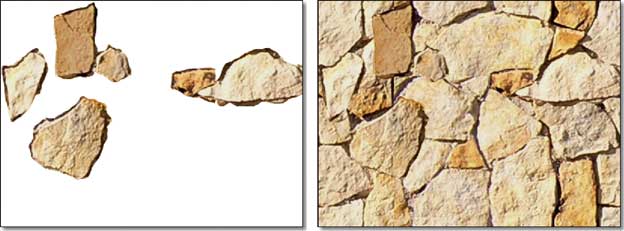 Questo che abbiamo visto, cioè il caso delle piastrelle quadrate o rettangolari, è senz’altro il più semplice, ma non il più comune. Quando l’elemento rappresentato nella texture non è così regolare, sorge un nuovo problema: non c’è una linea orizzontale o verticale su cui tagliare l’immagine, per fare in modo che le ripetizioni non presentino discontinuità.