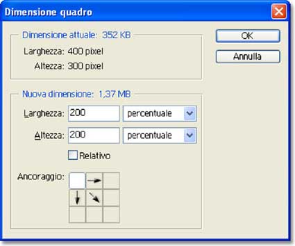 Seleziono l’intera immagine (Ctrl-A su Windows o Comando-A su OSX) e la copio (Ctrl-C o Comando-C su Mac). Poi raddoppio l’area di lavoro (Immagine/Dimensione quadro), rispetto alle dimensioni correnti (400x300 pixel).