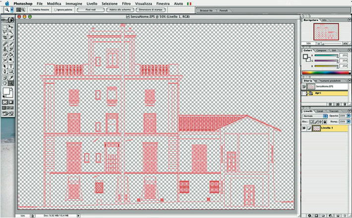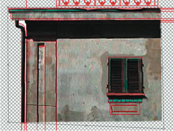 Alla base di tutto c'è, come sempre, il rilievo. E' infatti importante rilevare la posizione esatta delle finestre (e quanti più dettagli sia possibile) in modo da avere dei riferimenti su cui appoggiare le foto da raddrizzare. Una volta disegnato il prospetto a linee 2D con ArchiCAD occorre selezionarle tutte e colorarle, per facilitarne la visualizzazione in Photoshop, di rosso.
