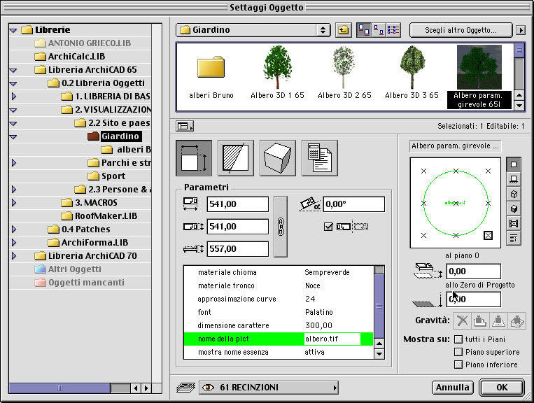 STEP 9: posizionate in pianta l'oggetto albero girevole e settate correttamente il nome dell'immagine che avete precaricato nella libreria attiva; in questo caso: nome della pict: albero.tif