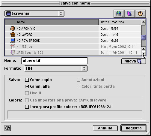STEP 6: potete ora salvare il lavoro in formato Tiff abilitando il canale alfa: