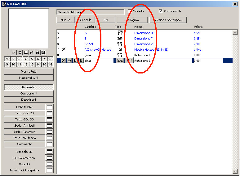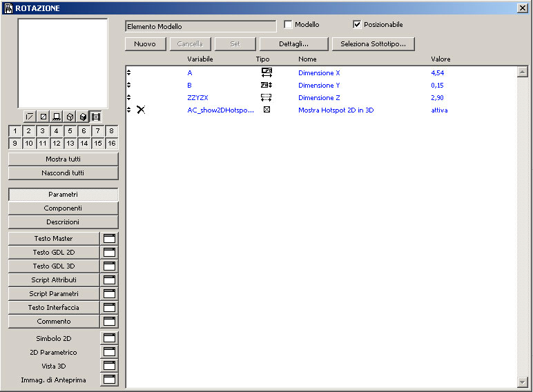 Il nostro nuovo oggetto sarà immediatamente disponibile nelle librerie caricate di ArchiCAD e presenterà solo due comandi nella lista dei parametri: le due rotazioni che abbiamo inserito.