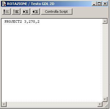 Chiudiamo la finestra e del “Testo GDL 3D” e clicchiamo sulla finestra bianca accanto il tasto “Testo GDL 2D” e scriviamo all’interno della finestra bianca il seguente comando: “PROJECT2 3,270,2”