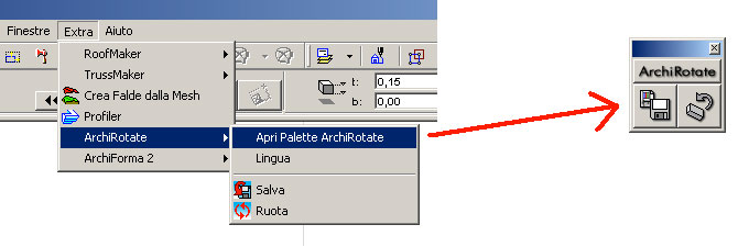 Inseriamo nella nostra finestra pianta l’oggetto (il logo) appena salvato, andiamo sul menu a tendina “Extra”lo selezioniamo e visualizziamo la palette di  ArchiRotate
