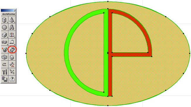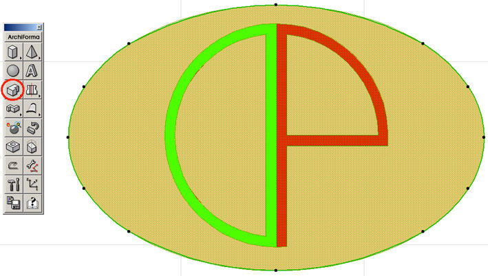 Dapprima, però, attiviamo lo strumento “Retino” dalla barra degli strumenti di ArchiCAD e attivando la “Bacchetta magica” (tenendo premuta la barra spaziatrice ) clicchiamo sul bordo delle figure perché ArchiForma estrude solidi solo “appoggiandosi” sui retini
