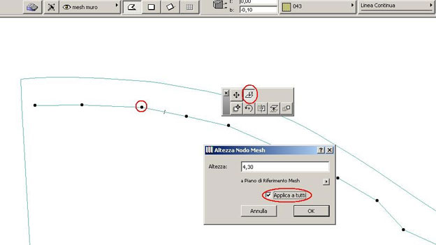 Anche questa volta clicchiamo con il tasto destro del mouse sulla linea che abbiamo appena tracciato in modo da evidenziare i nuovi nodi, clicchiamo su uno di essi in modo da far apparire la Pet-Palette per poi selezionare l'icona che ci permette di assegnare la quota al nodo: digitiamo il valore 4,30 metri e spuntiamo l'opzione "applica a tutti" (...i nodi della mesh).