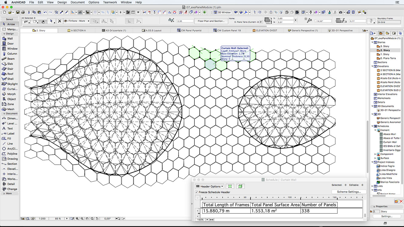 Usando gli elementi nativi di Archicad avremo i benefici di tutte le opzioni dei suoi componenti. Per la Curtain Wall si possono sviluppare in GDL componenti personalizzati dove si può controllare il dettaglio diverso per ogni singola scala, gestire una rappresentazione diversa fra 2d e 3d ed aggiungere ulteriori dettagli senza ripartire dalla geometria complessa di Rhino. Le Curtain Wall posso beneficiare di molte opzioni nella visualizzazione in pianta per avere un disegno più semplice senza troppi dettagli. Usando gli oggetti nativi di Archicad possiamo anche sfruttare l’opzione delle liste per calcolare per esempio le quantità, la lunghezza dei profili o la superficie dei pannelli.