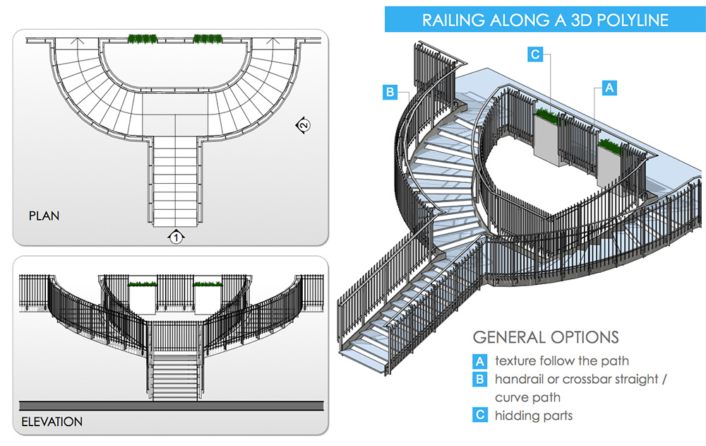 Le ringhiere 3DMD sono strumenti-oggetto per ArchiCAD.Con questi strumenti è facile disegnare una polilinea 3D, sia nella finestra 2D che in quella 3D. È possibile creare sia percorsi curvi che inclinati.Essi hanno molti parametri configurabili: posizionamento, tipo di pannelli, elementi tubolari, montanti, corrimani ecc. Una opzione permetterà di "stirare" a piacere la ringhiera e i pannelli o i montanti verranno posizionati e spartiti automaticamente.