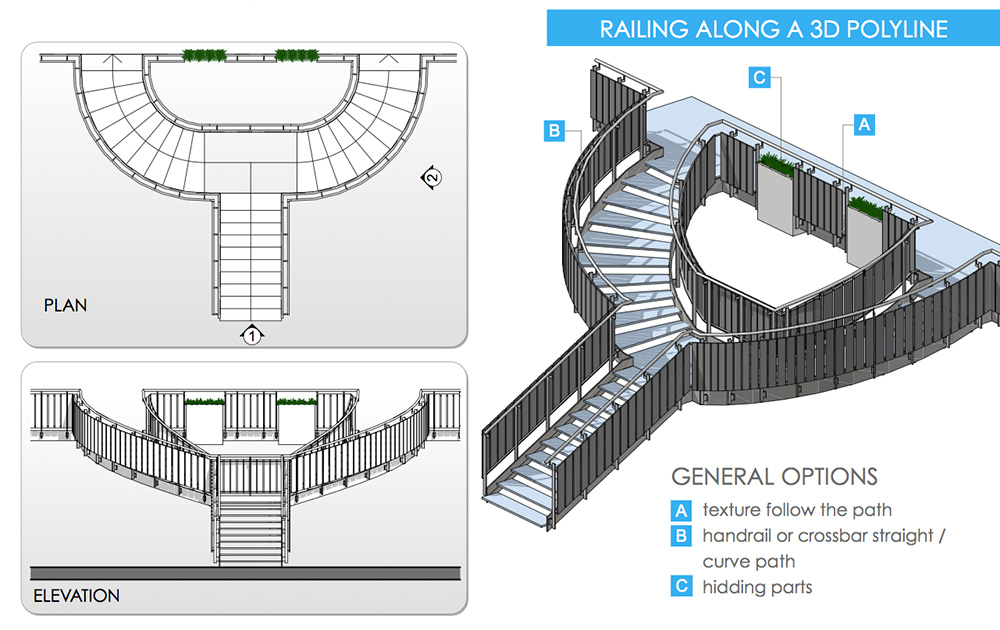 Le ringhiere 3DMD sono strumenti-oggetto per ArchiCAD.Con questi strumenti è facile disegnare una polilinea 3D, sia nella finestra 2D che in quella 3D. È possibile creare sia percorsi curvi che inclinati.Essi hanno molti parametri configurabili: posizionamento, tipo di pannelli, elementi tubolari, montanti, corrimani ecc. Una opzione permetterà di "stirare" a piacere la ringhiera e i pannelli o i montanti verranno posizionati e spartiti automaticamente.