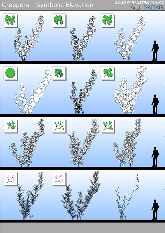 Gli oggetti sono realizzati con un basso numero di poligoni, hanno un fattore di crescita reale in base alla dimensione e inoltre hanno una corrispondente vista simbolica semplificata in prospetto e sezione.