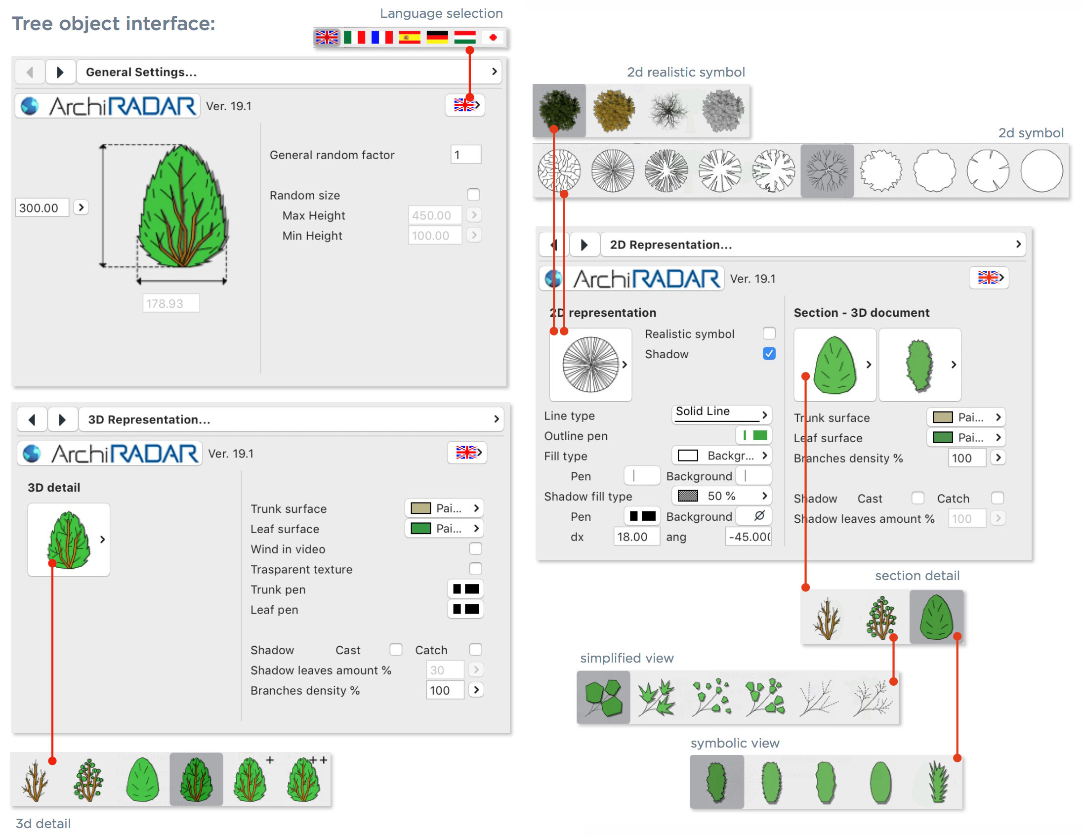 Gli oggetti sono realizzati con un basso numero di poligoni, hanno un fattore di crescita reale in base alla dimensione e inoltre hanno una corrispondente vista simbolica semplificata in prospetto e sezione.