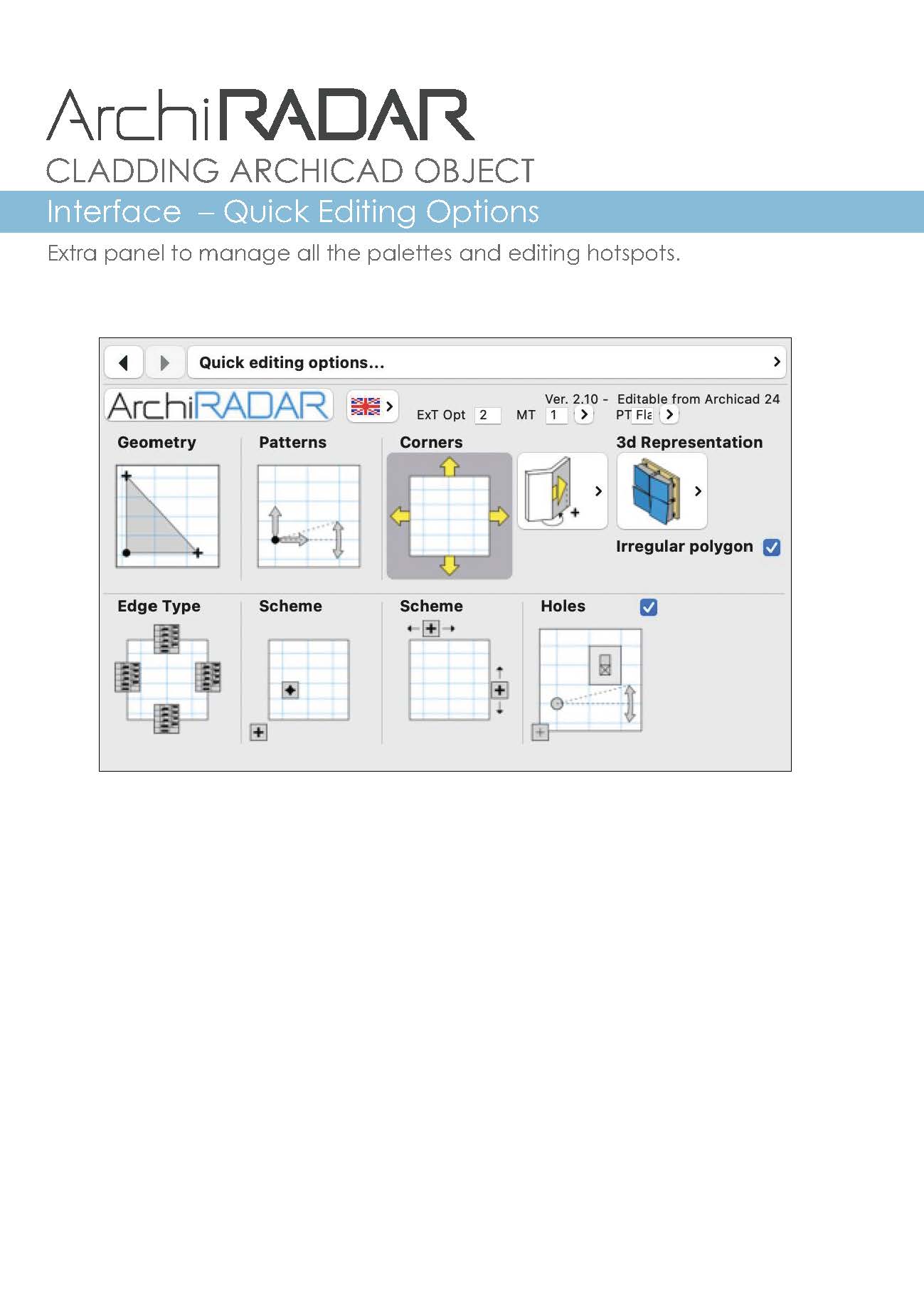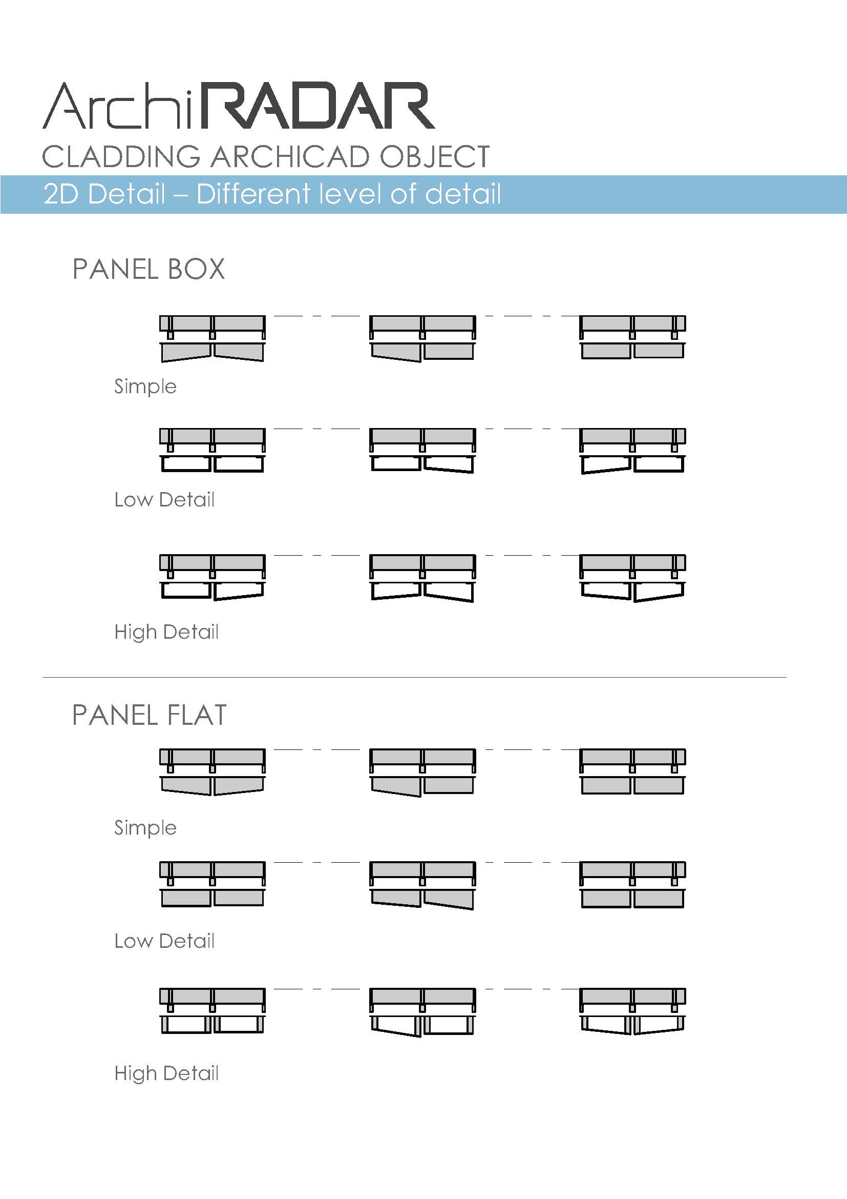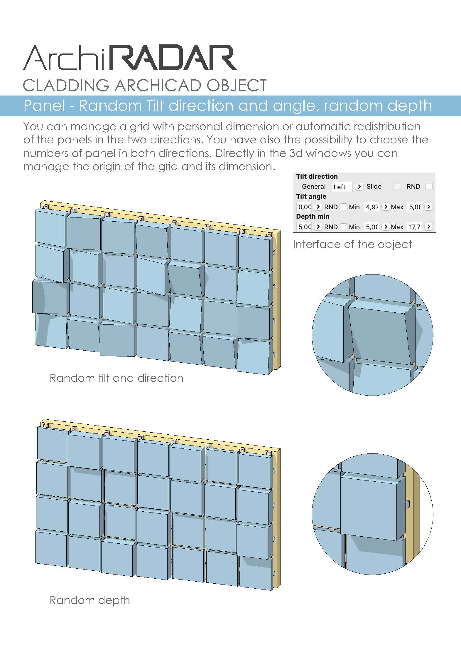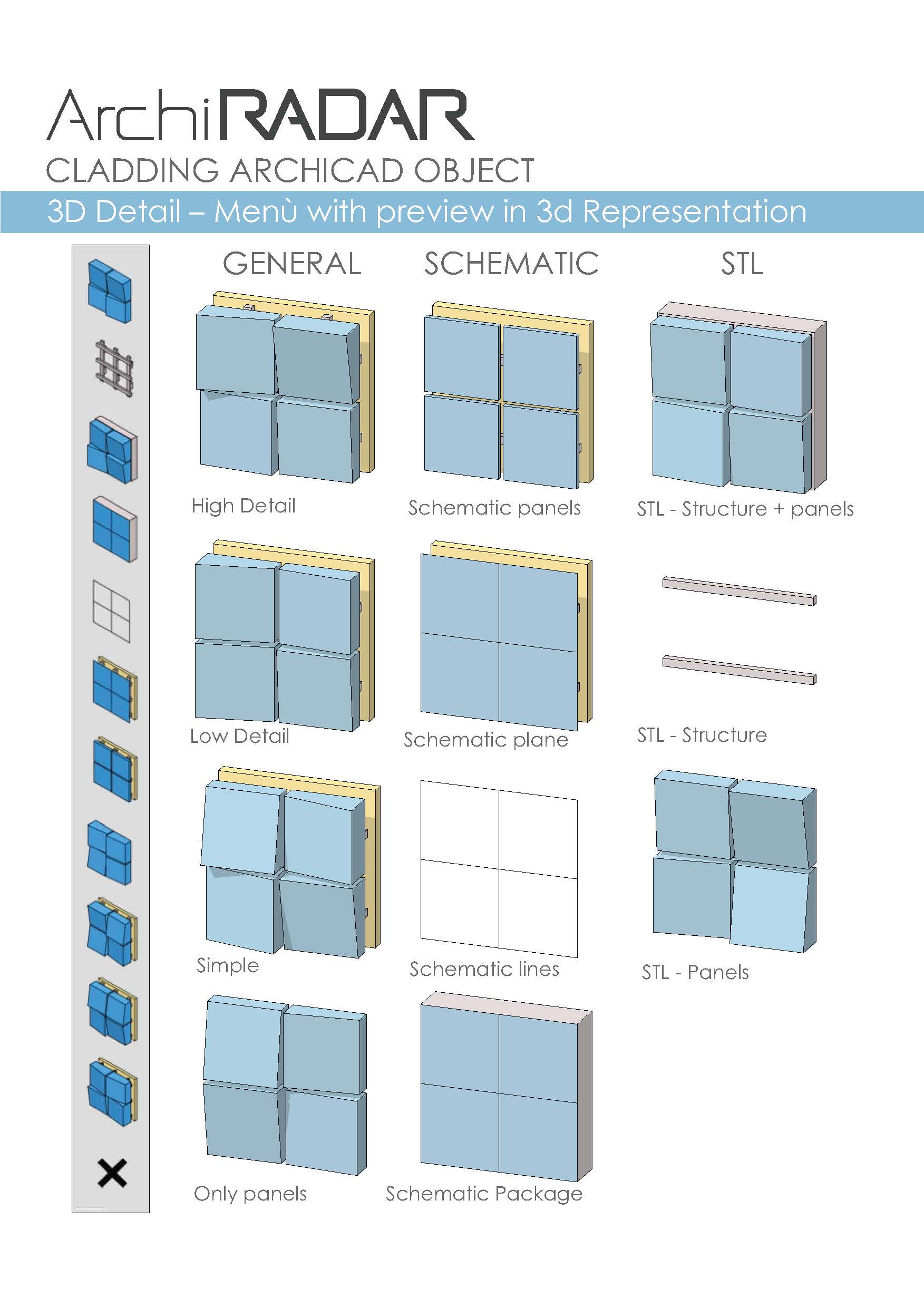 L'oggetto, completamente parametrico, può essere personalizzato per le texture, i pannelli, la sottostruttura e si può adattare ad innumerevoli soluzioni progettuali anche di facciate inclinate e poligoni complessi. Possono essere personalizzati anche i fori, le giunzioni e gli angoli su tutti i bordi, il livello di dettaglio in base alle viste (Opzioni Vista Modello).