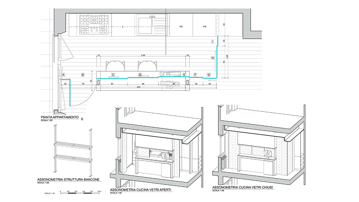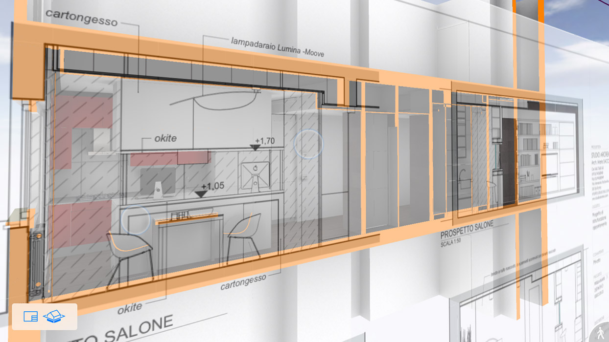 Il modello è stato utilizzato per la redazione di tutti gli elaborati, per il calcolo delle quantità, per la verifica dei nodi complessi, per la simulazione fotorealistica e per il supporto in cantiere. Il modello virtuale è stato adottato sia per la parte edilizia che per tutti gli arredi su misura.