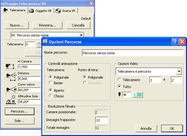 Può essere utile anche definire il percorso come "poligonale", nel caso che vogliate fare un'animazione con due o più telecamere perfettamente sovrapposte, per avere solo il movimento degli oggetti, mantenendo ferma l'inquadratura. L'ultima accortezza, ASSOLUTAMENTE NECESSARIA, è quella di attivare l'opzione "Ricostruisci il modello per ogni fotogramma". Questo ovviamente allunga i tempi di calcolo ma, diversamente, ArchiCAD crea il modello solo per il primo fotogramma, e lo utilizza poi per tutta l'animazione, senza modificare l'aspetto dei singoli elementi.